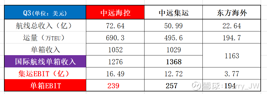 1)海控Q3集运EBIT 16.49亿美元,国际线单箱价格1276,单箱EBIT为239;