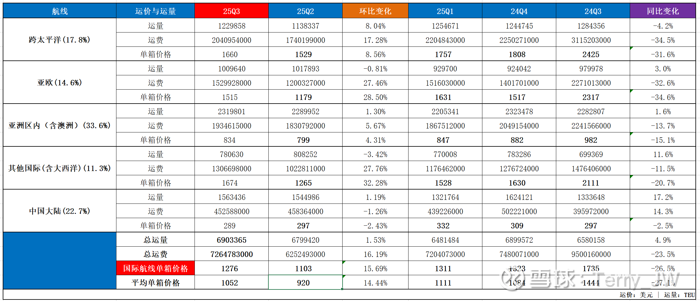 1)环比:① 单箱价格上涨14.44%(海外+7.8%),美线价格在关税驱动的抢运背景下如期上涨,欧线在二季度大跌20%后大幅反弹(+27.5%);② 运量上涨1.5%(海外-0.8%),分行航线看,美线增长最为明显;