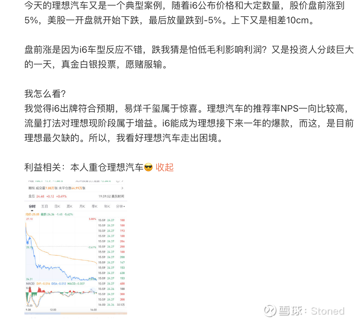 时间来到9月26日,理想正式发布i6,23.98的首销价格,标配冰箱、空气悬架、vla免费、和mega一样的5C超充。诚意满满,从发布后的反馈来看,大多数人对于售价和配置满意,没有太多槽点。当天发布后到美股开盘前,股价甚至从-3%涨到5%。但出乎意料的是,美股开盘后,理想从5%一直跌到-5%。不过也能理解,虽然车子不错,但低毛利可能会损害利润,资本市场有担忧也是非常合理的。但至少目前为止,在i6这个车型上,理想交出了一张及格的答卷。