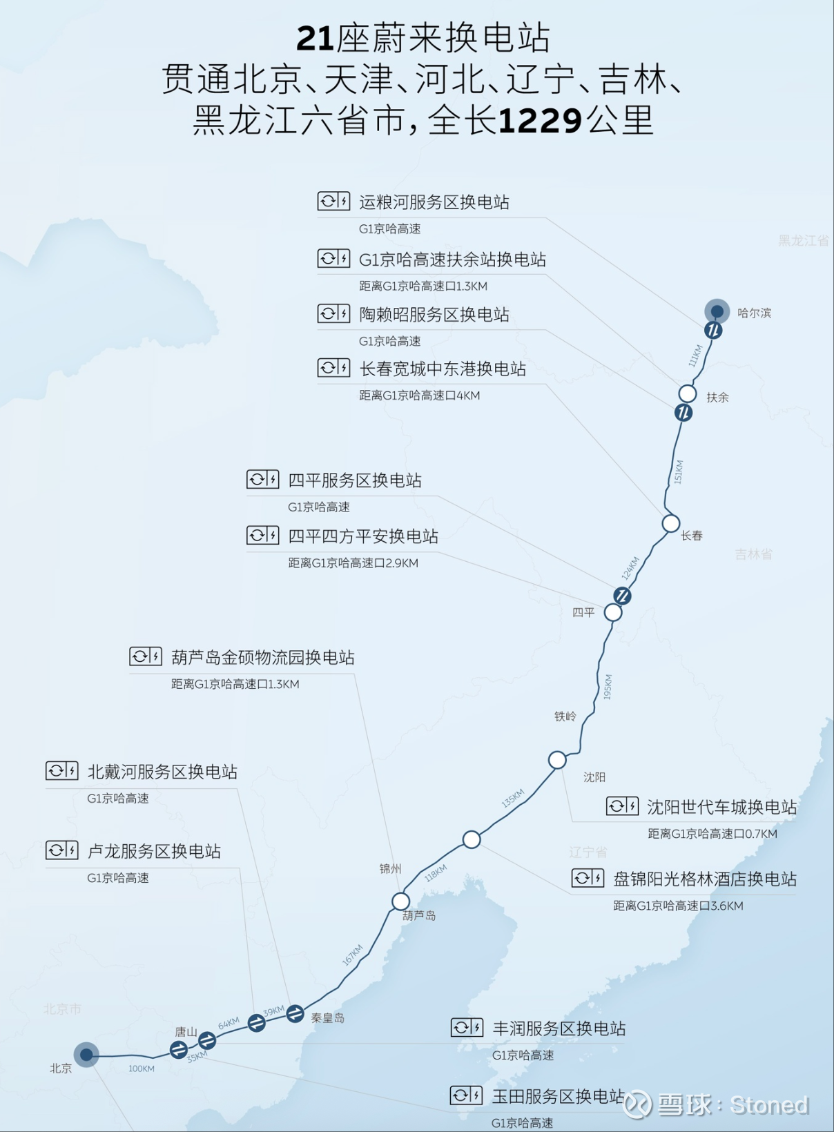 1. 目前京哈高速上,除去首尾和下高速充换电,在中间高速上,理想和蔚来都是6个服务区,共12个站点。