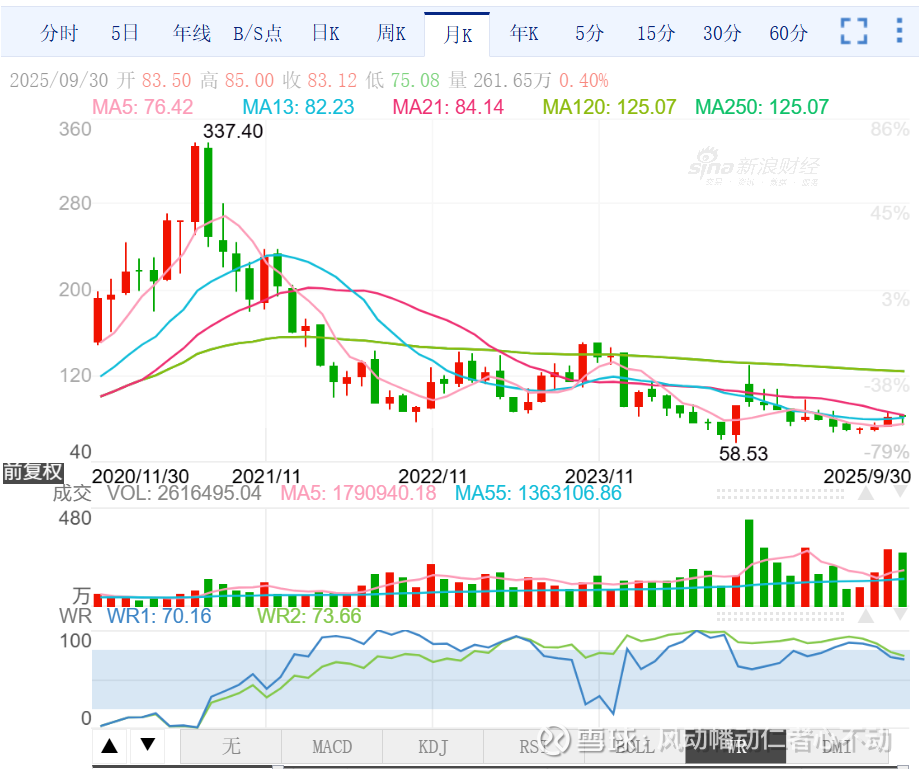 6、7、8三个月连续放量小阳线,9月其实是一个假阴线,K线已经翘头,但幅度很小;WR双线回进80。卓胜微已经度过了最艰难的时刻,反转趋势明显。