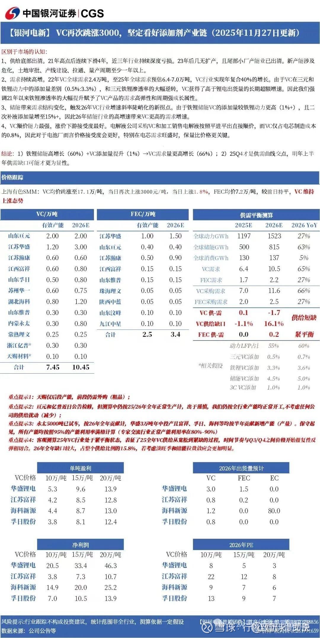 2,华盛锂电:公司招股书及投资问答公开信息显示现有9000吨VC产能,环评公示文件确认到3000+6000=9000吨,银河电新给的是VC产能12000吨,雪球上流出的一张图片江苏华盛1-9月VC销量是8657吨,折算下来年产能接近12000吨。