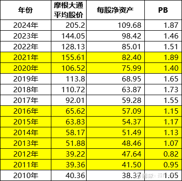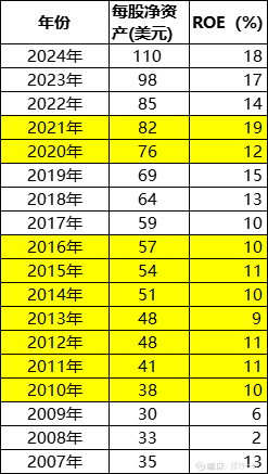 摩根大通是妥妥的价值股,且不算每年分红和大方的回购,在美股大牛市环境中跟着大盘指数同步上涨,15年间股价涨了五倍。不过从涨幅来看,在降息年份里基本上跑不赢S&P500指数,仅在加息周期的4个年份超过S&P500。从估值来看,2011-2016低利率环境下PB不到1.2,2021年、2024年随着美股大涨,估值达到了峰值1.89和1.87。