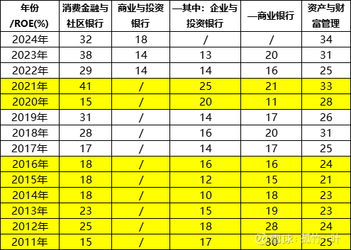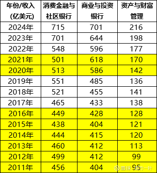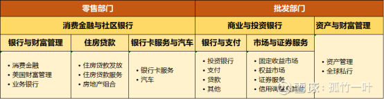 2007—2011年摩根大通分为6个业务板块:零售金融服务、卡服务、投资银行、商业银行、资金管理和证券服务、资产管理。2012—2023年调整为消费者和社区银行(含大通财富管理子板块)、公司和投资银行、商业银行、资产管理(含全球财富管理GWM和全球投资管理GIM两个子板块)四个主要业务板块。2024年将公司和投资银行、商业银行合并成为商业与投资银行部门。整体上摩根大通分为三个汇报部门,具体如下: