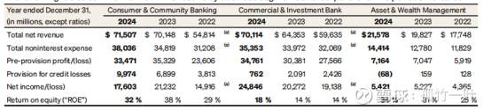 按照杰米·戴蒙的说法,摩根大通成功的关键在于以客户为中心,提供多元化的服务,坚守堡垒式资产负债表。全能型的摩根大通收入结构较为均衡,下图为2024年三个部门收入以及ROE情况,可以看出来公私收入对半开。杰米·戴蒙在上任之初就提出了各个业务单元之间的协作关系。摩根大通虽然划分为多个部门,但在业务上仍然贯通,因为觉得交叉销售有负面的意思,他称之为自然的产品线延伸,这种延伸也造就了均衡发展。