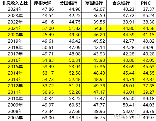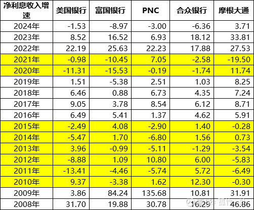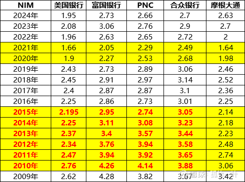 摩根大通的NIM水平跟美国银行差不多,但是比起富国银行、PNC和合众银行都要低。但由于摩根大通的对公对私比重相差不多,当利率下行时,净利息收入增速受影响较大,当上行时,增速要比其他零售比重大的银行要快。