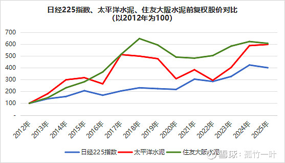 日本水泥企业的估值会受日本股市整体估值的影响。2013年初,日本股市开启了长达12年的大牛市。按照后复权计算,2012—2025年,太平洋水泥和住友大阪水泥均跑不过日经225指数。按照前复权来看,两家企业显著高于日经225指数,在水泥需求下行周期中的增长主要来自分红而非行情溢价。