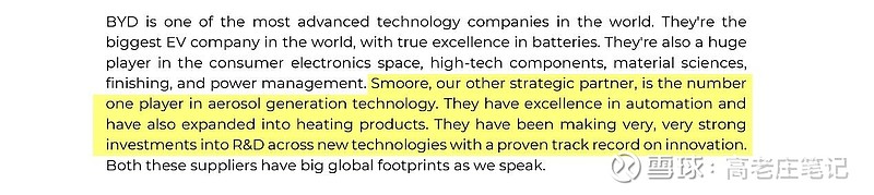 小结:BAT看中思摩尔的核心有两点。第一,思摩尔的自动化生产能力。这种能力的关键在于可以自动化快速、低成本的生产具有品质一致性的天量产品。对于BAT这种全球品牌,超大规模的出货如果遇到超过容差的产品质量问题,他是无法接受的!第二,BAT承认自己研发能力不足,需要通过外部伙伴合作来弥补不足。那么只有思摩尔这种具有超强雾化、加热技术研发能力的企业,才能帮助BAT去维持在新型烟草领域的领先地位。后者代表的是0-1的进化,前者代表的是1-(十、百、千)亿的突破。BAT看中思摩尔的正是这缺一不可的研发和生产能力。