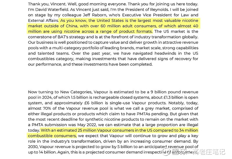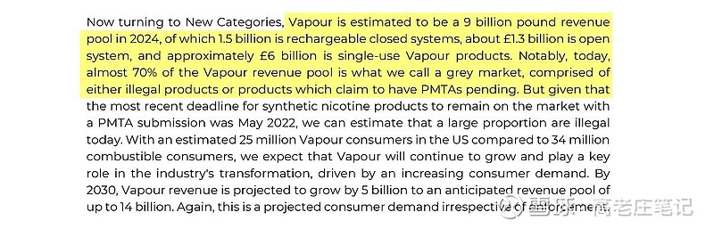 小结:2024年BAT在美销售约10亿英镑。BAT的CEO认为,随着市场监管进一步加强,BAT有很多手段去支持获得20亿英镑(60/3=20)的市场规模。第二,BAT已经提交了带有年龄验证功能的雾化产品PMTA,FDA很想加速推动。不过还得看FDA最后的行动。第三,带有年龄验证功能通过PMTA,意味着特征口味也可过审。所以BAT的CEO认为,年龄验证功能通过PMTA,且监管进一步加强,BAT可以获得60亿英镑市场规模中更大一部分。
