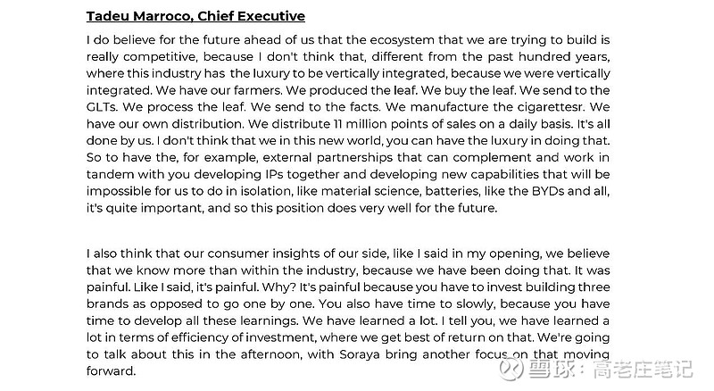 Tadeu Marroco的回答说——1、过去百年间,BAT可以垂直整合(传统卷烟)产业链。BAT有农民生产烟叶,企业自身也外购烟叶。BAT把烟叶送到工厂加工,生产卷烟。BAT还有自己的分销渠道,我们每天都要把卷烟送到全球1100万个分销点。以上所有BAT均可独立完成。2、今天,(新型烟草)能做到(类似传统卷烟)产业链垂直整合是奢望。我们无法独立开发新型烟草产品,和外部伙伴合作弥补产业链上的不足显得相当重要。这种布局对未来是相当有利的。