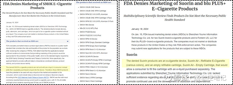 2024年1月16日,FDA首次给开放式雾化产品头部品牌SMOK发出MDO。紧接着19日,FDA继续向开放式雾化产品Suorin发出MDO。1月18日,SMOK母公司艾维普思(IVPS)向美国第五巡回上诉法院提起上诉,至今无下文。