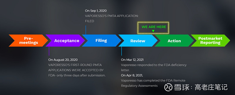 现在来看思摩尔开放式雾化产品Vaporesso的PMTA进展。2020年8月,FDA接收思摩尔提交的PMTA材料。2020年9月,FDA就进入了评估思摩尔材料充分性的Filling阶段。2021年3月,FDA进入评估材料内容的Review阶段。2021年8月,FDA完成Vaporesso的远程监管评估。至今,Vaporesso一直处在Action(发MDO或MGO)前的阶段。