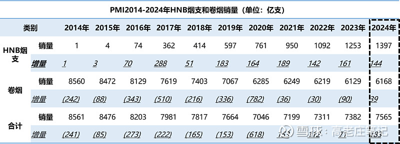以2014年IQOS发布作为起点,2024年为终点。PMI的卷烟销量从8560亿支降到6168亿支。HNB烟支增加到1397亿支。静态看,PMI将消亡的8560-6168=2392亿支卷烟量中的58%转换成了HNB。