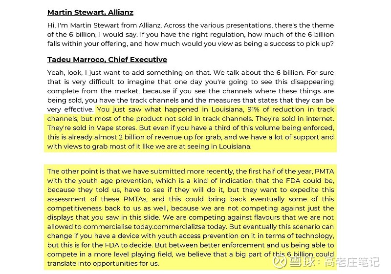 期初,雷诺CEO的回答不痛不痒。后面BAT的CEO进行补充——1、直面现实,认为60亿英镑的一次性雾化产品完全消失是不可能的。大家可以追踪到从普通销售渠道(如便利店)出货的数据,但大多数转到互联网,雾化专卖店的销售情况是无法追踪的。2、不过正如大家在路易斯安娜州看到的情景,假如只有1/3的市场规模因监管需要被替代,因为BAT有很多手段去支持我们获取这部分市场,那么这个空出来差不多20亿英镑(约27亿美元)规模的市场机遇我们就能抓住。3、2024年上半年,BAT提交了带有年龄验证功能雾化设备的PMTA。FDA告诉BAT,他们想要加快这些PMTA的审批进度。从某种角度上看,这种带有年龄验证功能的雾化设备能够被审批通过。当然,大家必须等待看看FDA是否会去推动这件事。4、在一个不公平市场环境下,BAT不仅在与口味雾化产品竞争,还需要面对更多品牌的冲击。如果带有年龄验证功能的雾化产品通过PMTA,同时市场进一步加强监管,那么在一个更加公平的环境下,60亿英镑中的很大一块市场能够转化为BAT营收增长的机遇。