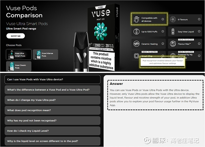从网站上获悉,这个陶瓷芯Vuse Ultra Pods同样适配前代所有烟杆,而Vuse Ultra烟杆也适配前代所有Pods。只是这些组合搭配无法体验口感优化的优点。
