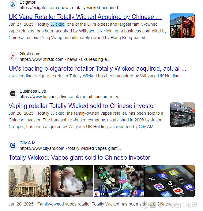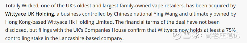 2025年6月26日,外网多个媒体报道了一则新闻——英国雾化产品零售商(Totally Wicked)已被中国投资者收购。由Wittyace HK控股的Wittyace UK收购了Totally Wicked至少75%股份。穿透Wittyace HK股权后显示,公司由汪莹控制。