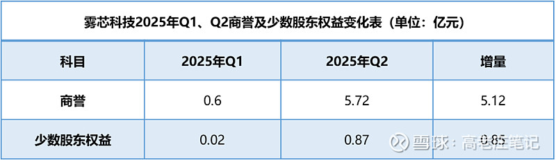 从雾芯科技《2025年Q1业绩报告》、《2025年Q2业绩报告》中可知,公司因收购Totally Wicked75%股份,其商誉从2025年Q1的约0.6亿元增加到2025年Q2的约5.72亿元,增量约5.12亿元。期间少数股东权益从0.02亿元增加到0.87亿元,增量约0.85亿元。基于以上(假设)条件后,投资者可计算得: