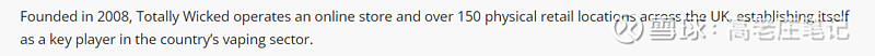 雾芯科技以善于销售著称。根据资料显示Totally Wicked除了经营线上商城外,在英国线下有150多个实体店。