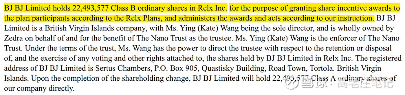 Relx Inc.于2020年3月向BJ BJ Limited持股平台发行22,493,577股。根据Relx计划这部分股份将向参与者授予股份激励。