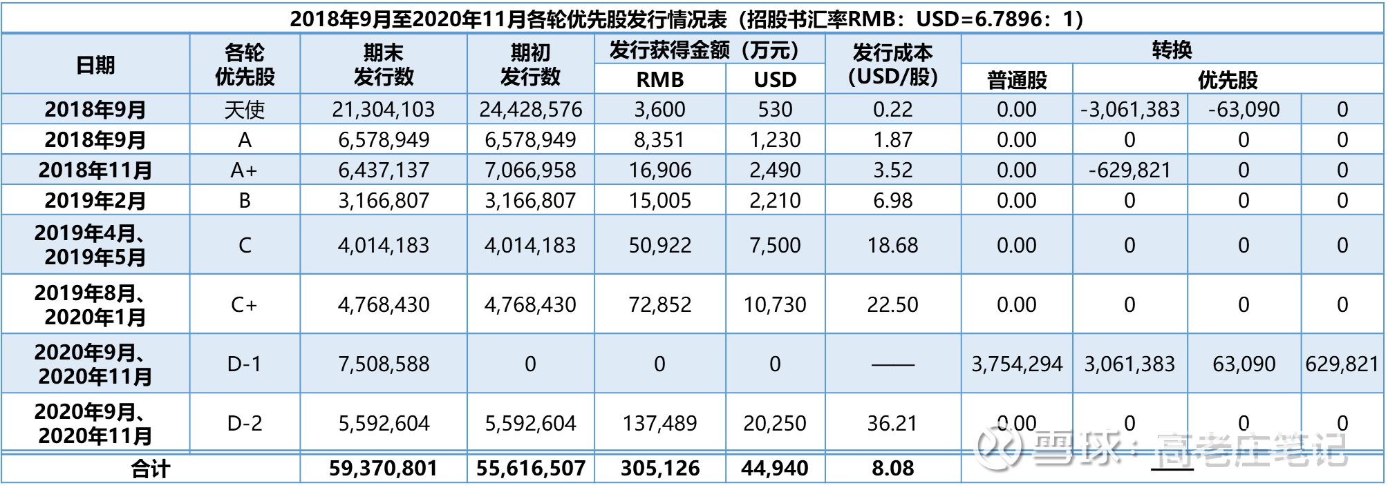 2018年9月至2020年11月,共对外发行了55,616,507股优先股,共筹得约4.5亿美元,每股成本约8.09美元。上市前按照1:10分拆,这部分优先股平均成本约0.8美元/股。