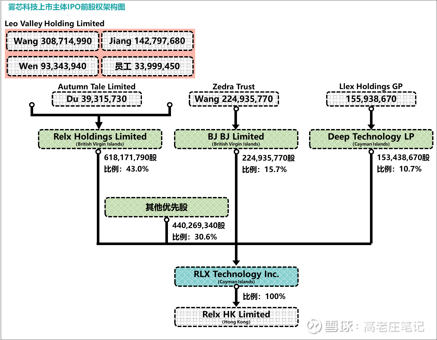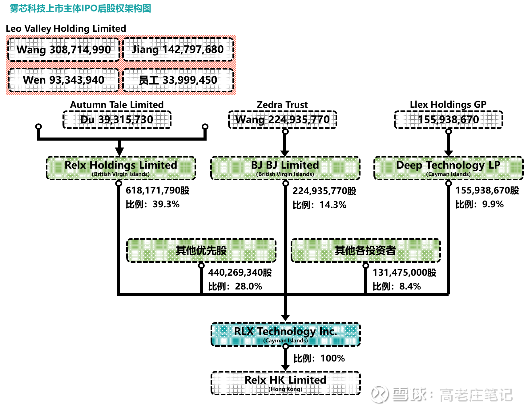 拆掉雾芯科技/RLX Tech母公司Relx Inc.这一层架构,由Relx Inc.的股东转为普通股后直接持有雾芯科技/RLX Tech。并于2021年1月11日将每一股普通股拆分成十股,故雾芯科技/RLX Tech总股本为1,436,815,570股,分拆如下: