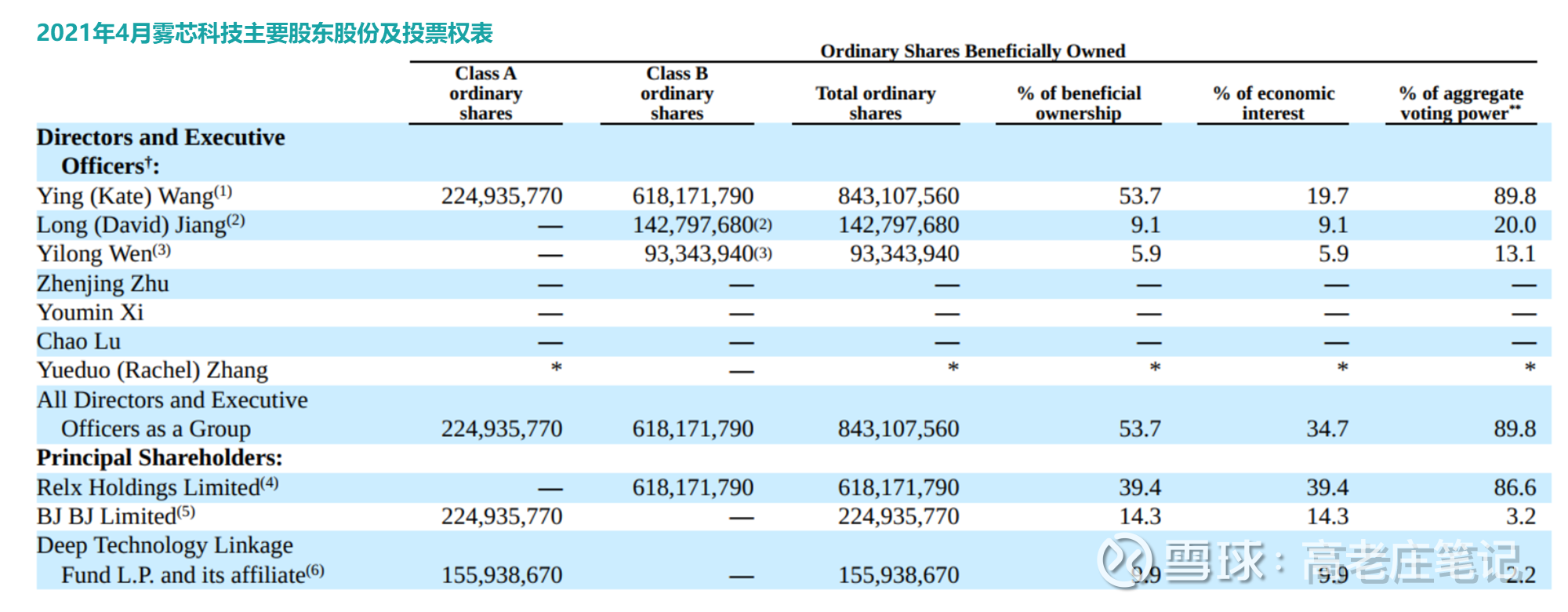 Relx Holdings持有雾芯科技/RLX Tech618,171,790股,去掉Wang的308,714,990股,剩余309,456,800股的所有权虽然登记在Jiang、Wen、Du和其余员工名下,但对应投票权均交由Wang。BJ BJ Limited持有雾芯科技/RLX Tech 224,935,770股,这部分虽然登记在Wang的名下,但用作员工股权激励,Wang仅有投票权。至此,Wang享有的Beneficial Ownership(受益所有权)股份数=308,714,990+309,456,800+224,935,770=843,107,560股,占总股本的53.7%。