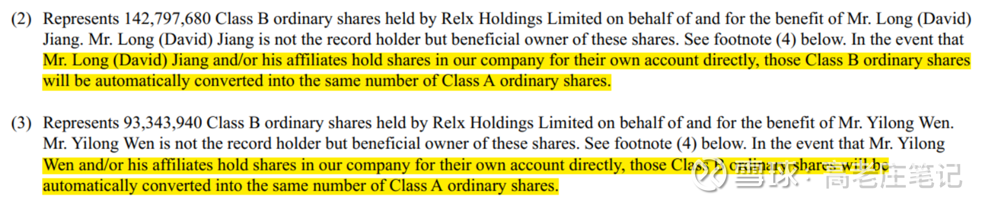 属于Jiang、Wen、Du和其余员工309,456,800股B类股于2021年从Relx Holdings中转出至个人持股平台。转出后该部分B类股自动转为A类股。至此,仅有Wang的Leo Valley Holding Limited持股平台持有雾芯科技/RLX Tech308,714,990股为B类股,其余股份均为A类股。