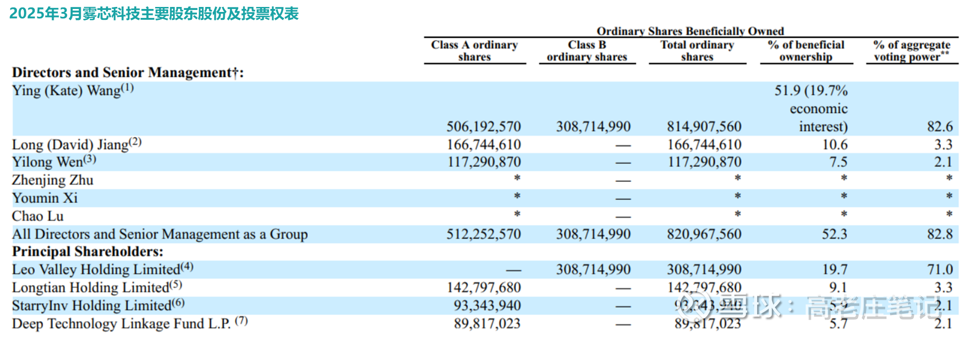 ——Wang :其Economic Interest(经济权益)股份数依旧是Leo Valley Holding Limited持有308,714,990股,占总股本约19.7%。翻阅雾芯科技/RLX Tech《2022年度报告》,Wang获得11,973,460股激励股份,2023年3月该比例为20.4%,后续应该均已卖出。其Beneficial Ownership(受益所有权)股数为814,907,560股,占比约51.9%。其Aggregate Voting Power(合计投票权)约为82.6%。