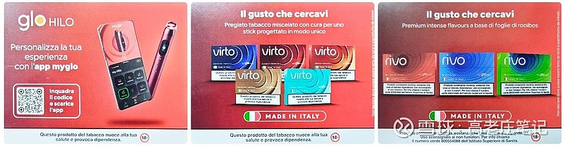 与日本全国版保持一致,意大利版Hilo的Virto与Rivo烟支盒内也均附有介绍卡片。卡片正面统一为告知消费者可扫码下载用于连接烟杆的“myglo”APP。背面信息首先均强调烟支在意大利生产,其次根据烟支类型分别说明:Tobacco基质的Virto烟支共有5种口味;Rooibos基质的Rivo烟支共有3种口味。