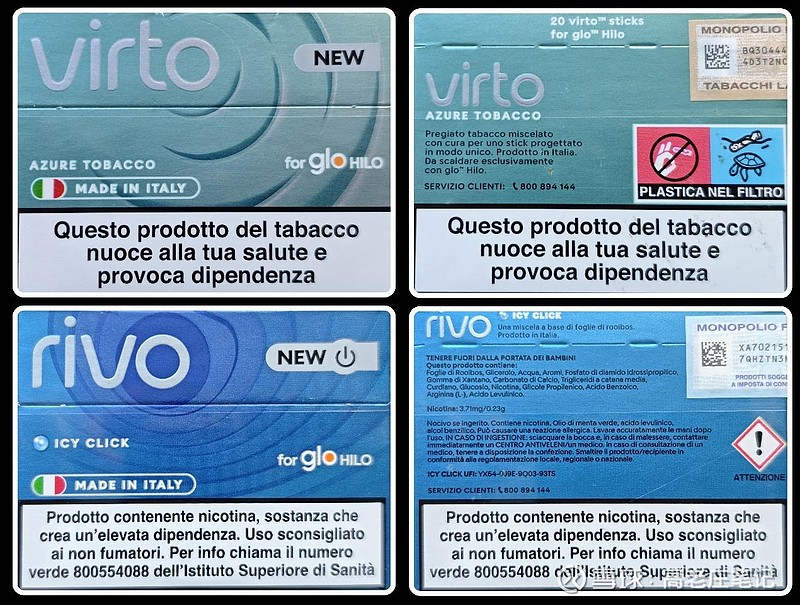 Virto背面明确说明:该产品为专供Glo Hilo烟杆使用的烟支,由精选烟草制成。此外,包装上还印有“TABACCHI LAVORATI”、“MONOPOLIO FISCALE”及“PLASTICA NEL FILTRO”等意大利语法定标识。
