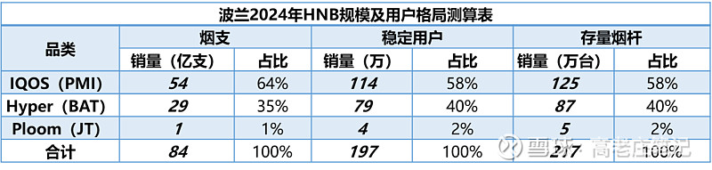 2024年,三家合计后波兰的HNB用户数约197万户,年消耗烟支约84亿支。按照约1.1的系数(有些用户同时使用多台烟具)计算,存量使用的HNB烟具数约217万台。
