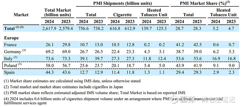 PMI历年《年度报告》均会披露波兰HNB和Cig(经调整后)动销(IMS)数据。2024年,IQOS烟支销量约54亿支,Cig销量约201亿支。IQOS销量占全口径(HNB+Cig)市场份额(Market Share)约9.1%。PMI的HNB和Cig销量占全口市场(HNB+Cig)份额约43.9%。