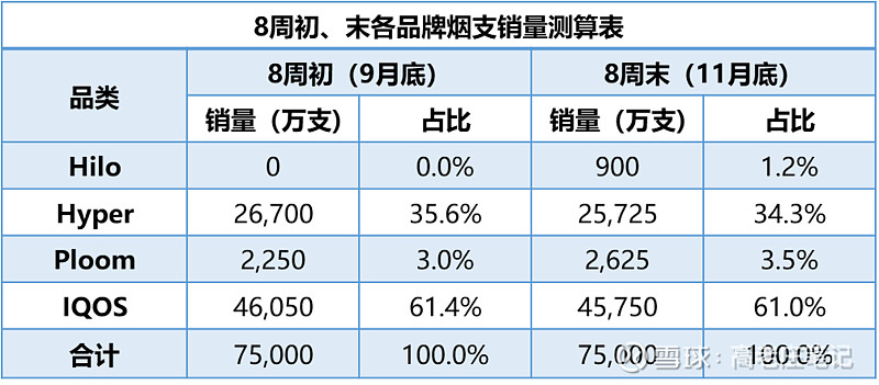 9月下旬Hilo上市后8周内烟支表现:Hilo烟支市占率爬升至1.2%。Hyper烟支份额从38.6%降至37.8%,IQOS烟支份额稳定在61%左右。