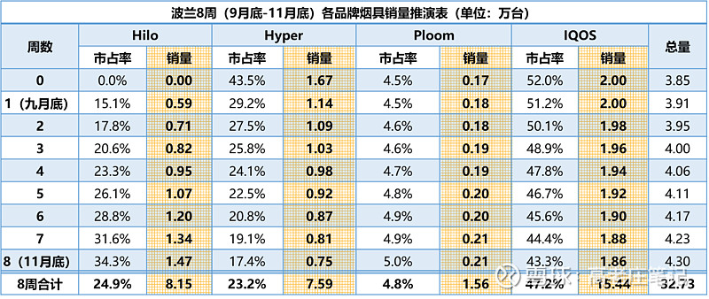 9月下旬Hilo上市后8周内烟具表现:Hilo烟具市占率攀升至34.3%。Hyper烟具市占率降到22.4%。IQOS烟具市占率从51.2%下降至43.3%。