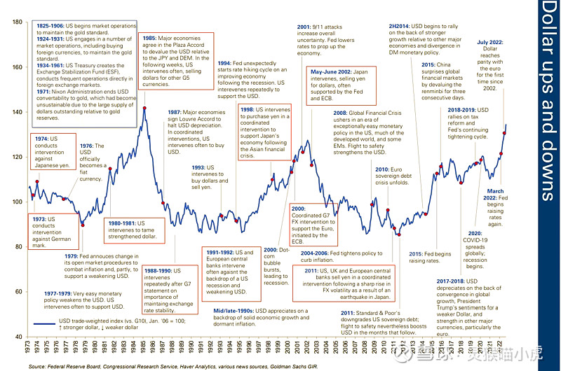 (注明:dallar ups and downs不是美元指数,1999年欧元出现,美元对其他主流货币趋势要复权)