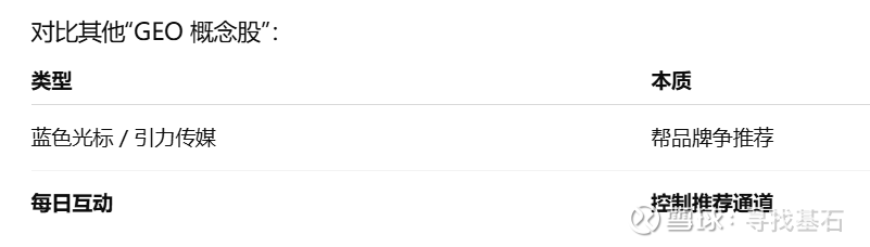 与 $蓝色光标(SZ300058)$ $引力传媒(SH603598)$ 相比,在GEO领域,行业位置不同。蓝色,引力,是 GEO 时代的“广告代运营商”,每日互动,是 GEO 时代的“AI流量操作系统”。