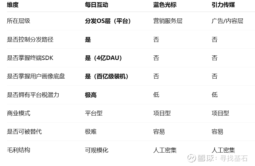 当 AI 搜索全面普及:AI 推荐 = 新流量入口,推荐路径 = 新平台税,谁控制“最后一公里分发”,谁控制入口。每日互动已经站在这个“操作系统级”位置。看比较