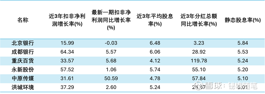 书接上回,经过更新后的三维度指标筛选出来6个符合要求的红利股票:北京银行、成都银行、重庆百货、永新股份、中原传媒、洪城环境。