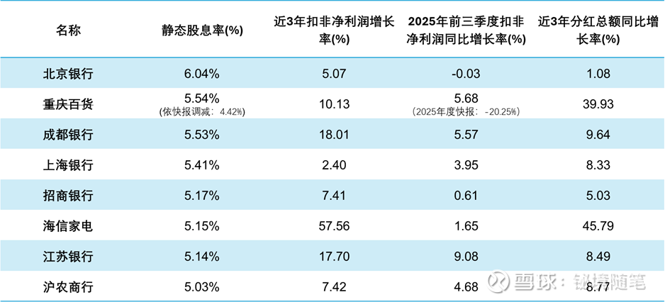 根据最新的总市值变化情况,基于前述的三维度指标,筛选出新的一批业绩稳定增长、分红长期可持续、当前股息率有吸引力的红利股票:北京银行、成都银行、上海银行、招商银行、海信家电、江苏银行、沪农商行。