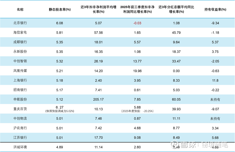 按照近三年平均净利润增长率为正、最新一期净利润增长大于-1%,近三年分红总额平均增长率为正、每年近3年每年股利支付率均小于90%、股息率大于5%以上这一标准重新筛选,一共选出了13只“红利奶牛”。但多数都是已经持有的股票,“跌出机会”的情况比预想的少,仅新增申能股份和中创物流两只股票。