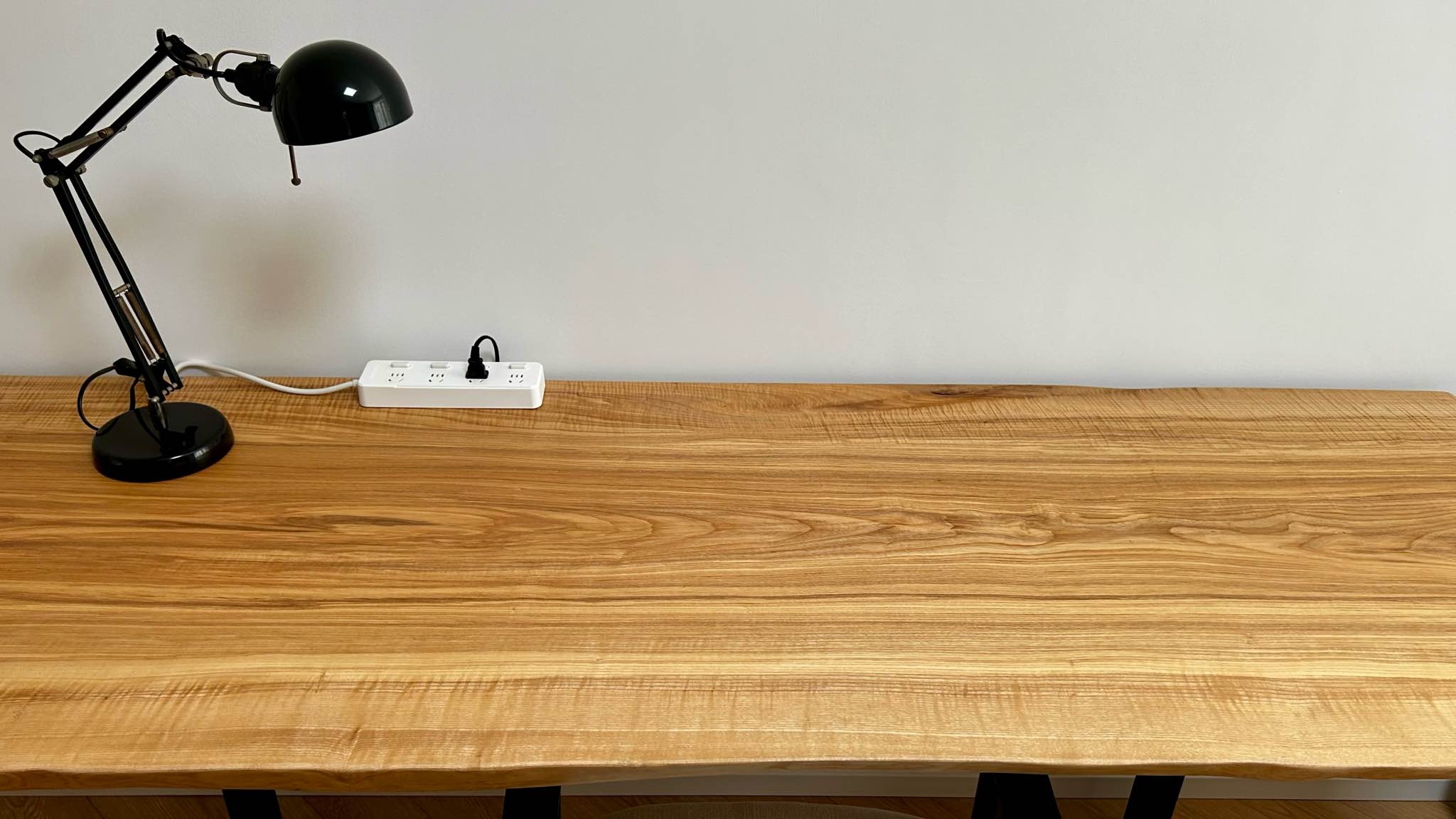 这次装修买了一块2.4米长的北美白蜡木板用作书桌,稍有遗憾的是,为了在同一面墙安放一个双人沙发床和低音提琴架,我把整板截掉40公分变成了2米长的“小桌子”。不过毕竟有了一块完全属于自己的空间,还是很开心的。近期暂时拉了一把餐椅过来,回头我会买一把昌迪加尔椅作为配套。对面书架没整理完,雏形初具,凑乎看吧。