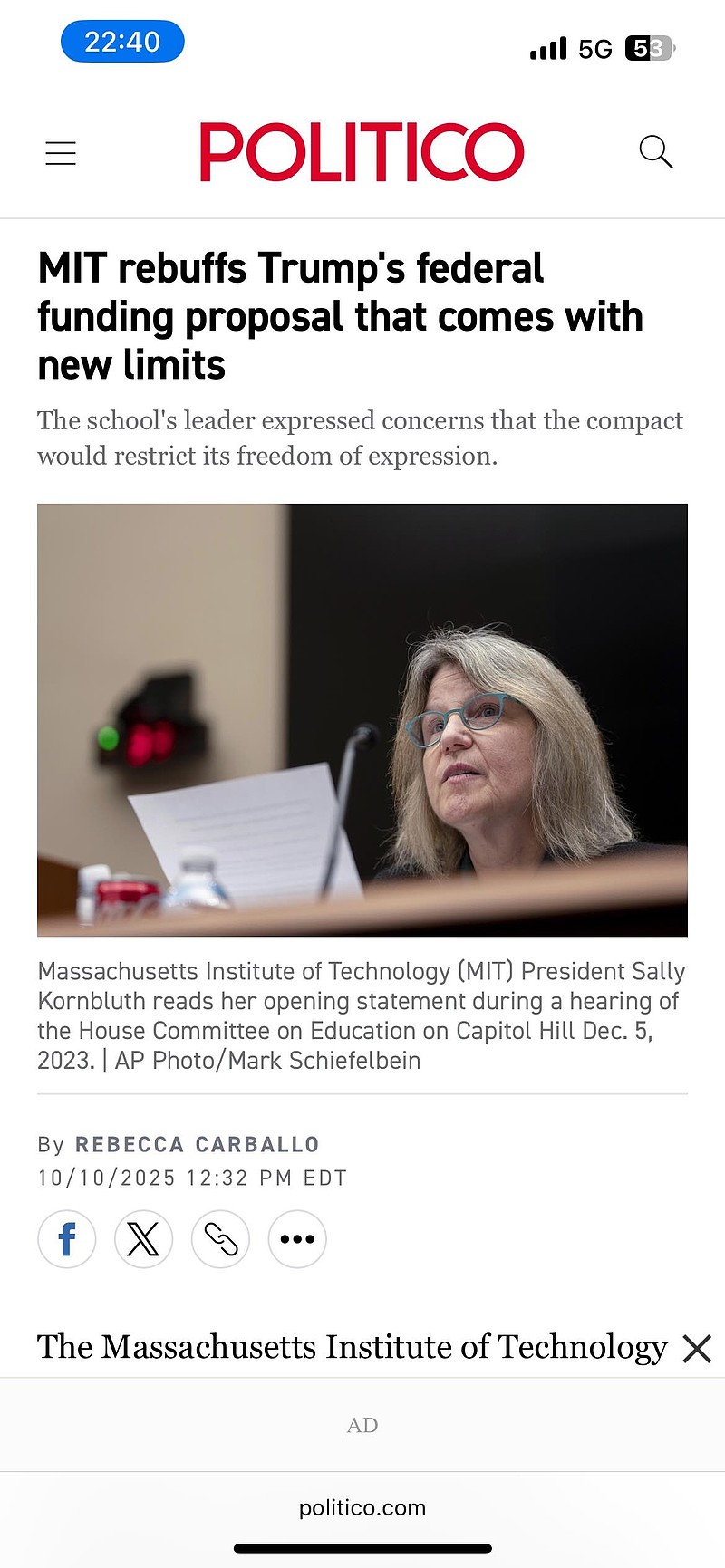 麻省理工学院(MIT)成为首家公开拒绝联邦政府研究教育资金的美国高校,因为他们不愿牺牲自己在研究、财务、雇佣和招生方面的自由以换取白宫在划拨经费时的特别照顾,有种!