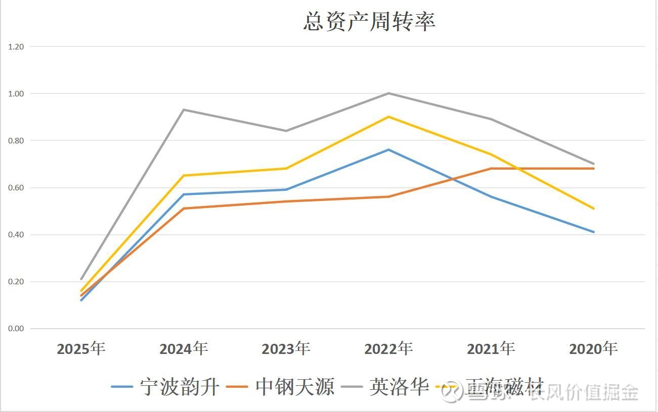 一季度,周转速度最快的是英洛华,总资产周转了0.21次。其次正海磁材,再次中钢天源,再次宁波韵升。