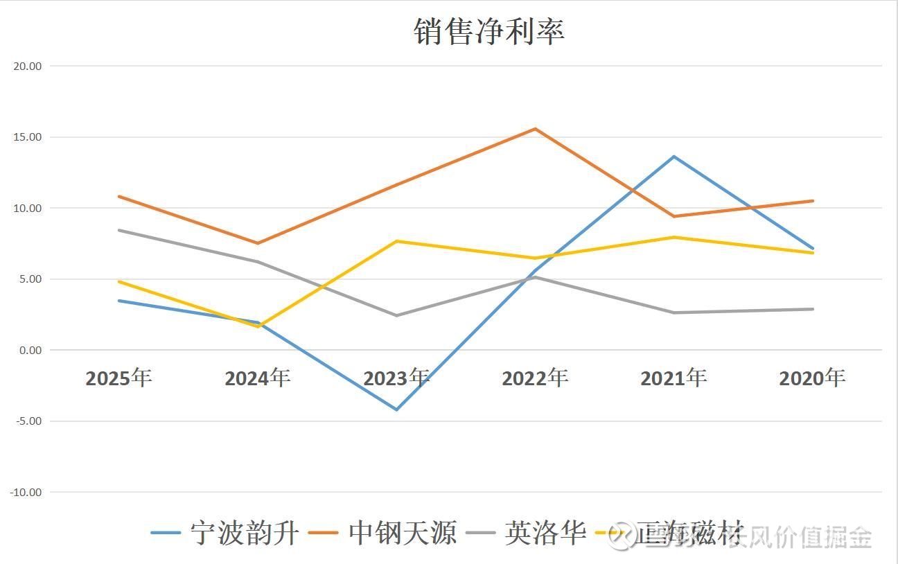一季度,盈利能力最强的是中钢天源,每100元收入,就赚了10.78的净利润。其次英洛华,再次正海磁材,再次宁波韵升。