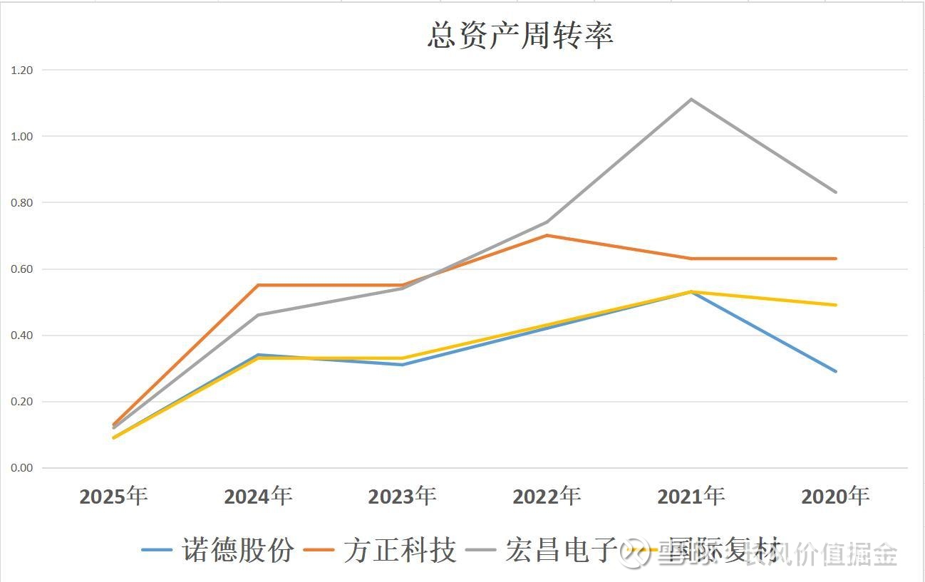 一季度,周转最快方正科技,总资产周转0.13次。其次宏昌电子,再次诺德和国际复材。
