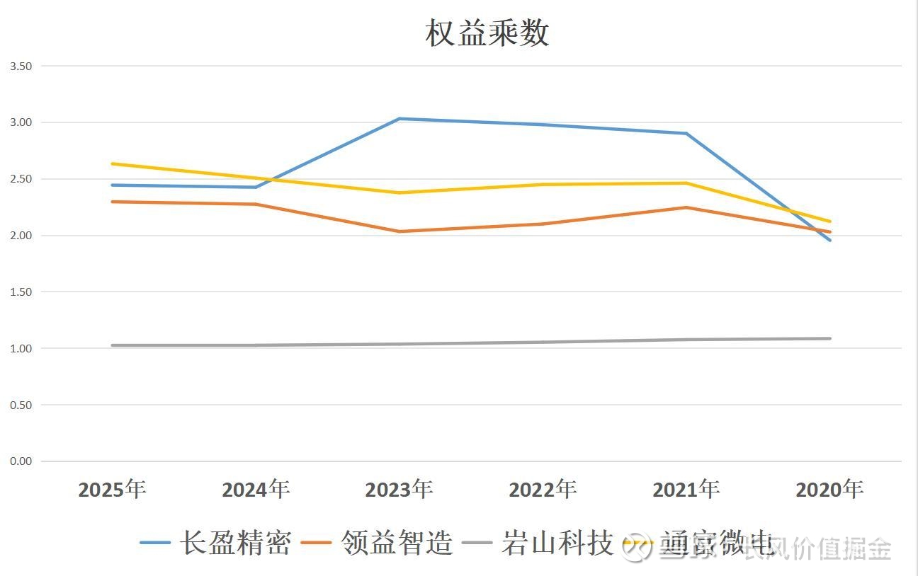 财务杠杆最高,通富微电2.63倍。其次长盈精密,再次领益智造,再次岩山科技。