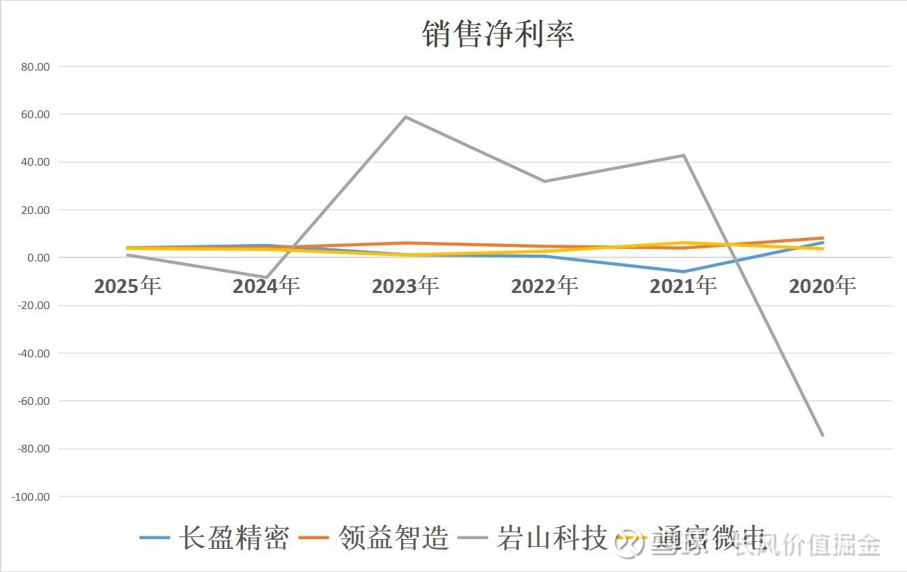 二季度,盈利能力最强,领益智造,每100元收入,有3.99元净利润。其次长盈精密,再次通富微电,再次岩山科技。