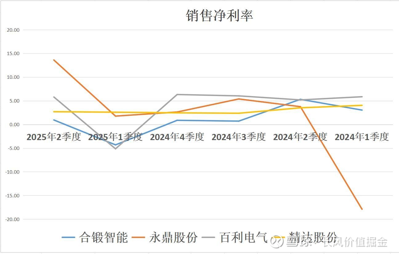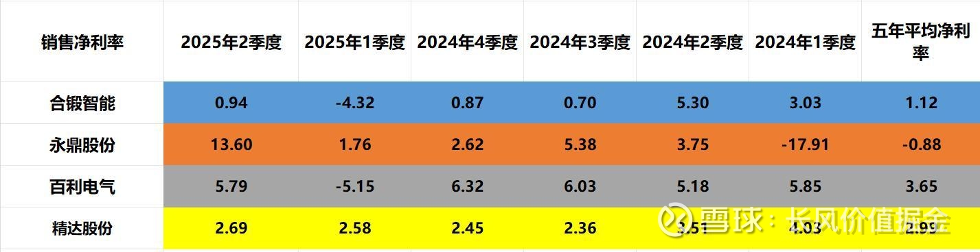 二季度,盈利能力最强,永鼎股份每100元收入有13.6元的净利润。其次百利电气,再次精达股份,再次合锻智能。