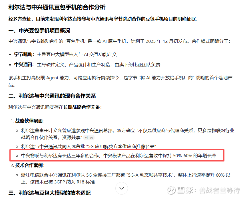 利尔达还是中兴通讯的长期战略合作伙伴,每年中兴模块产品在利尔达营收中保持 50%-60% 的年增长率。