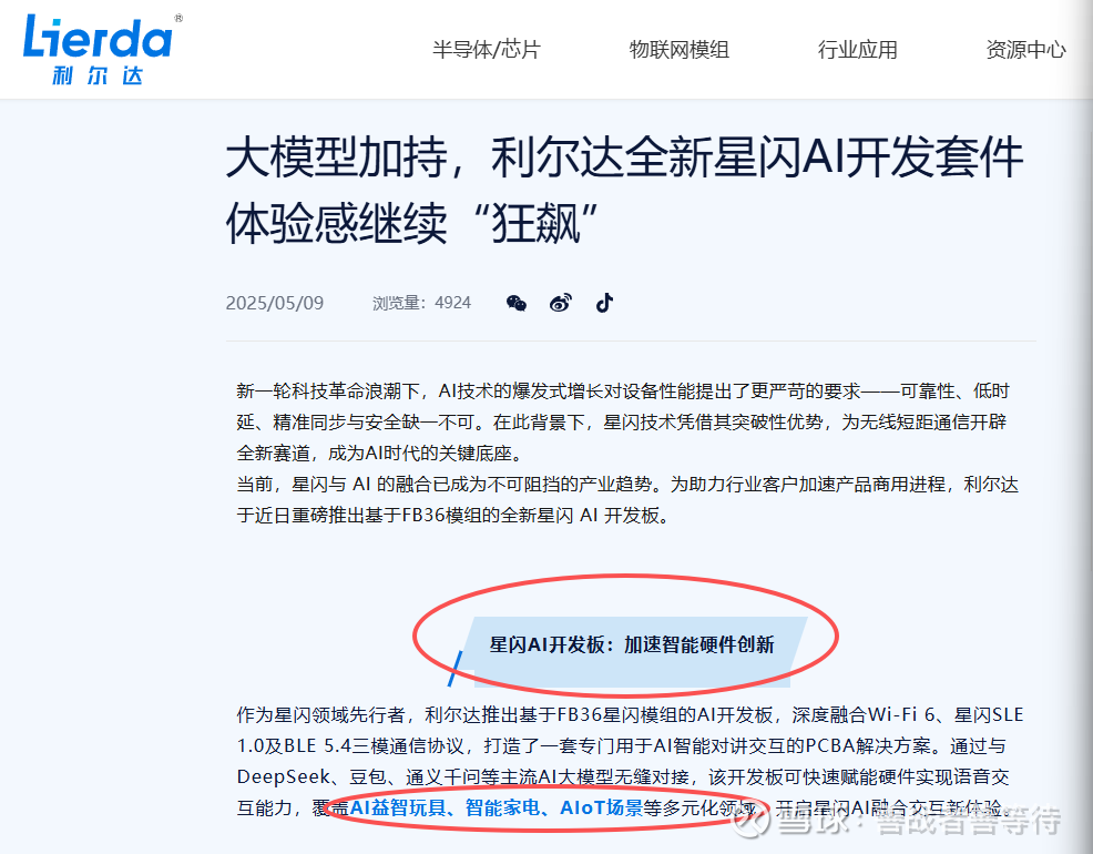 $利尔达(BJ920249)$ 与字节跳动的豆包大模型和扣子合作,推出AI开发板,AI故事机、AI智能玩具等产品方案。
